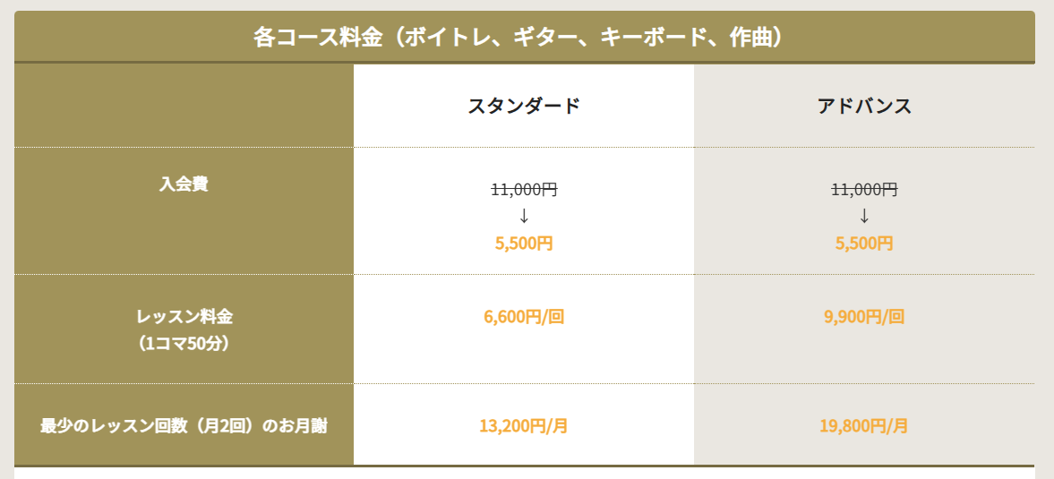 レッスン料金(ボイトレ、ギター、キーボード、作曲の各コース)